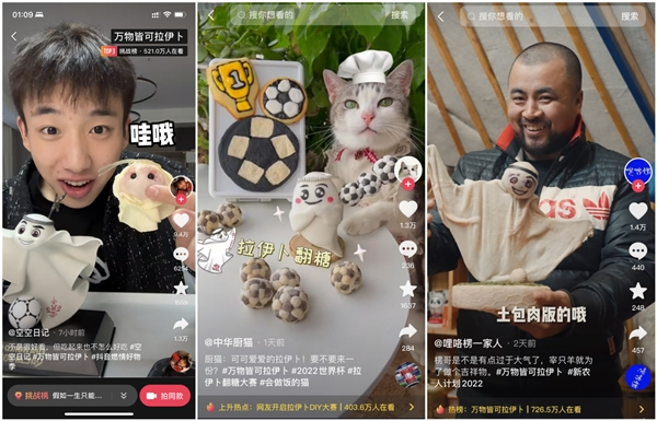 除了手帕纸,脑洞大开的网友们还为拉伊卜“开发”出了众多可食用材料。@空空日记 用两张饺子皮捏出了一个“丑萌”版的拉伊卜;@中华厨猫 则用翻糖把拉伊卜和足球做成一道精致的甜品。而最“大手笔”的要数@哩咯楞一家人 ,视频里,这对来自内蒙古的夫妇,用羊肚和韭菜花做了一个肚包肉版拉伊卜,刷新了网友们的脑洞上限。