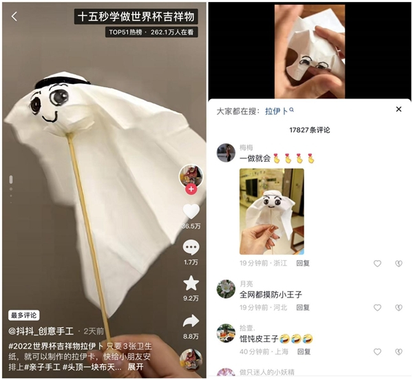 除了球星,本次世界杯的吉祥物拉伊卜,也是网友们DIY的主要目标之一。用3张普通的手帕纸,@抖抖_创意手工 在十几秒的时间内就做出了一个有着萌萌大眼睛的“微型拉伊卜”。近40万网友为她的创意和动手能力点赞,还有不少网友在留言区晒出自己的“学习成果”。