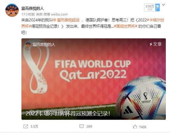 因此,我把2022卡塔尔世界杯得冠全部记录下来带回2022年11月28日,再三犹豫之下,在我的新浪微博写出来!希望能激发德国队赢得比赛!改写这屈辱的历史!这不是预测!是真实记录!