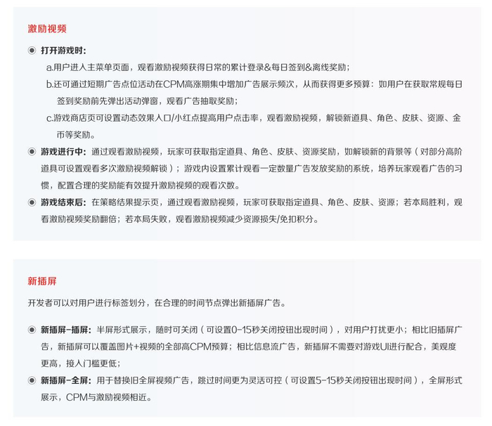 中度休闲游戏广告样式相对单一,大多以激励视频为主,需要在激励视频的基础上精细化运营,以提升ARPU、拓展收益空间。