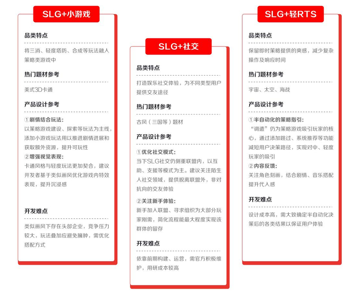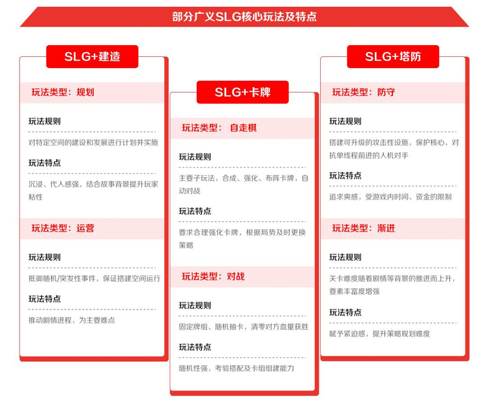 ①广义SLG:包含如建造、卡牌、塔防、ARPG、MOBA等具备策略性玩法的游戏品类。较早的品类融合为策略类游戏开发者提供了丰富的玩法参考,策略类游戏多样性提升。