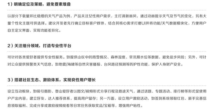 作为刚需品类,天气类App用户量级庞大且具备较强的使用粘性,蕴含开发潜力。建议开发者明确产品定位避免要素堆叠,提供差异化、专业性功能,以活动激励等方式搭建社区生态,提升产品综合竞争力。