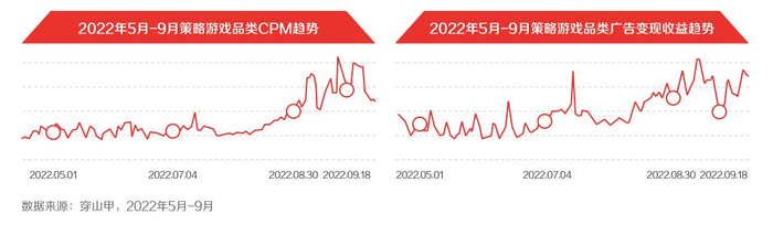 •商业化表现:随着策略游戏的轻度化,对广告变现的探索进一步加速,释放品类商业潜力。根据穿山甲数据,自2022年5月以来,策略游戏的CPM水平呈现快速增长态势,收入水平也实现逐步提升。