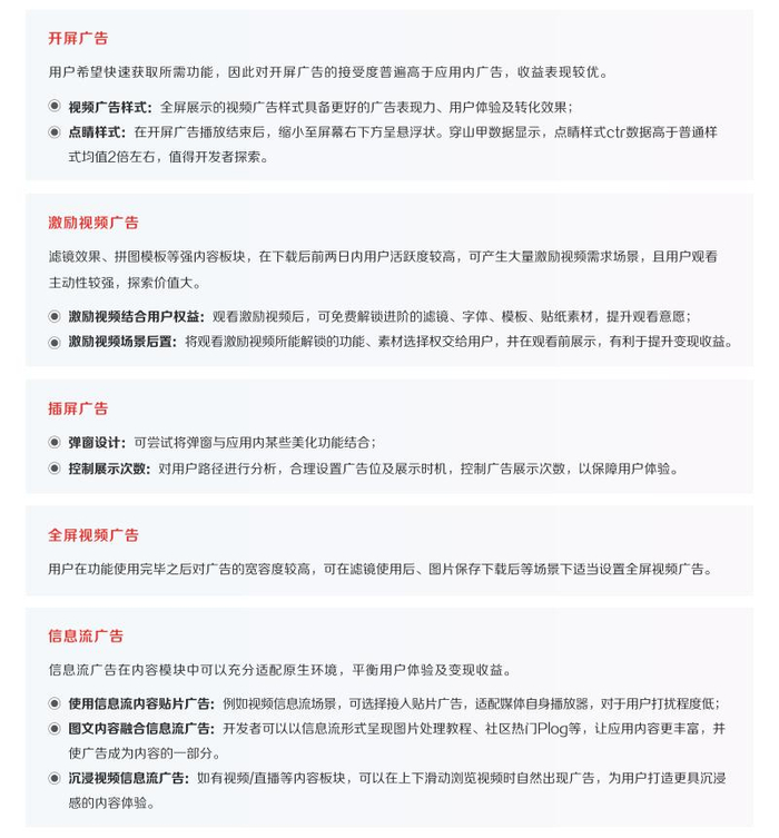 分广告样式来看,图片处理类产品的IAA收入贡献为信息流>新插屏>开屏>激励视频>全屏,且样式收入分布相对均匀。