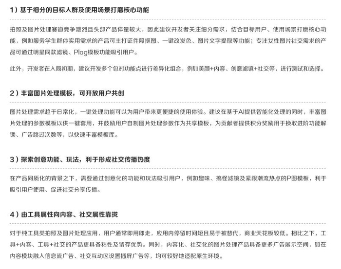 作为发展型品类,拍照及图片处理类应用抓住图片分享需求发展内容与社交,其行业、商业、内容表现均较为稳健,且呈现增长态势。在头部产品地位稳固、竞争激烈且同质化的背景之下,开发者可考虑深耕细分场景创意化玩法,实现差异化突围。