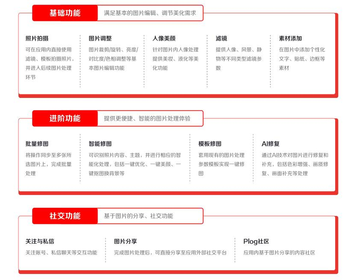 在应用开发设计方面,通常以基础功能凸显产品核心定位,以进阶、创新功能塑造差异点。此外,在用户强烈的图片分享需求之下,社交功能也已成为图像处理类产品的必备模块。
