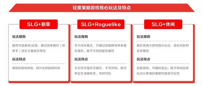 ③轻度策略游戏:中、重度SLG的市场竞争较为激烈,玩法/画风差异度低。大量新进开发团队选择着眼轻度品类与SLG的融合,填补玩家碎片时间,获取市场份额。