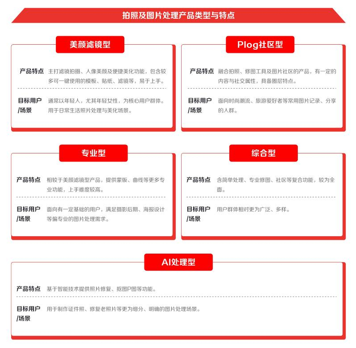 根据产品的主打功能设置,可以将图片处理类应用分为美颜滤镜型、Plog社区型、综合型和AI处理几大类型,分别面向不同的人群和需求。