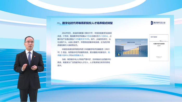 第一个是数字化时代呼唤高职院校人才培养模式转型。随着5G、云计算、大数据、人工智能与区块链为代表的数字技术的发展与应用,世界已经进入了数字化发展的新阶段。十八大以来,国家高度重视发展数字经济,多次强调要发展数字经济。大家也可以看到,报告当中明确指出,要推进教育数字化,建设全民终身学习的学习型社会、学习型大国。2022年1月国务院印发的《“十四五”数字经济发展规划》也明确提出,到2025年,数字经济迈向全面的扩展期,数字经济核心产业增加值占国内生产总值比重达到10%;到2035年,数字经济将迈向繁荣成熟期,力争形成统一公平、竞争有序、成熟完备的数字经济现代市场体系,数字经济发展水平位居世界前列。数字经济高质量发展离不开一大批适应产业需求,具有扎实的数字技术技能的人才,这对职业教育人才培养提出了新的要求。