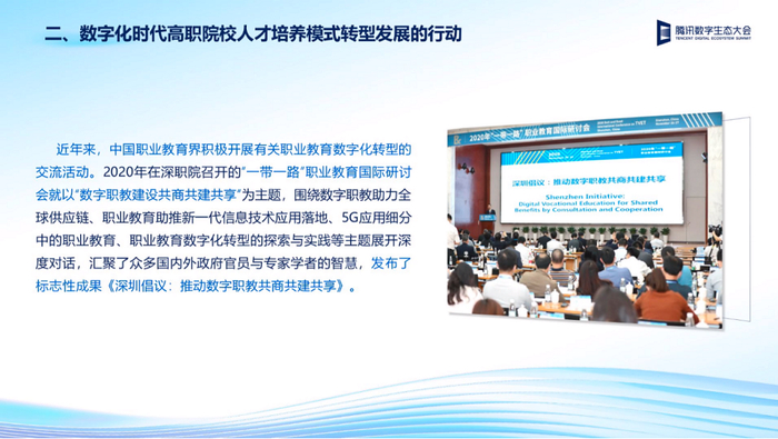 其次,近年来,中国职业教育界积极开展有关职业教育数字化转型的交流研讨活动。2020年,在深圳职业教育学院召开的“一带一路”职业教育国际研讨会,以“数字职教建设共商共建共享”为主题。会上也发布了标志性的成果《深圳倡议:推动数字职教共商共建共享》。