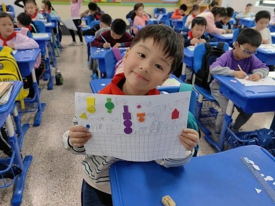 二年级的同学们利用各种图形拼搭成美丽的图案,并进行创意绘画。精彩!