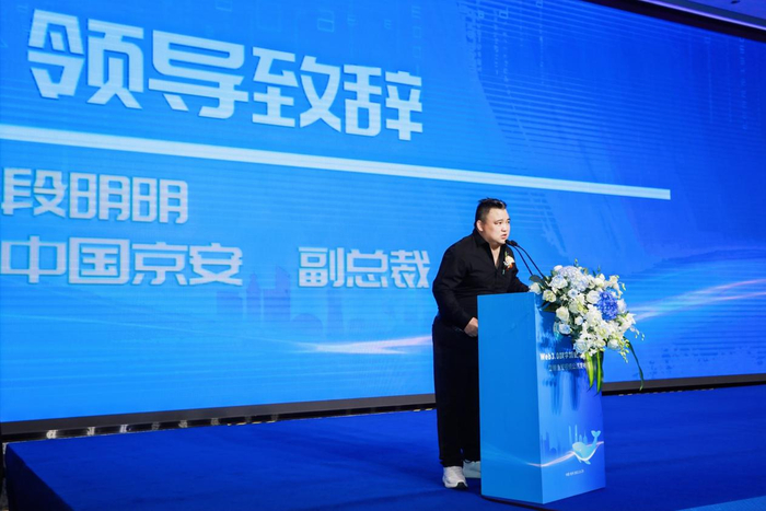 中国京安副总裁-段明明先生、京安蓝盾总经理-奚榕女士、海南神龙数科董事长-汤润霞女士、海南神龙数科CEO-严杰先生、中国京安数字改革小组组长-方博士、海南中平大数据董事长-陈总、海南鲸系文化董事长-贾总参加了鲸鱼公测发布仪式。