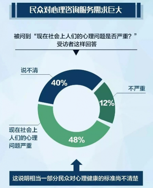 据报道,中国科学院心理研究所发布的2020版“心理健康蓝皮书”《中国国民心理健康发展报告》(2019-2020)(以下简称“报告”)显示,当被问到“现在社会上人们的心理问题是否严重?”48%的受访者表示:现在社会上人们的心理问题严重;其中40%的人表示:说不清;仅有12%受访者表示:不严重。这说明相当一部分民众对心理健康的标准尚不明确,且民众对心理咨询服务需求巨大。