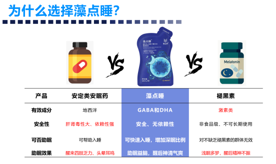 在这种情况下,以海之钥的藻点睡为代表的第三代助眠产品诞生了。“藻点睡”是一款对于“有益于身体,有足够营养效果”且对人体没有伤害的功能食品,能够缓解精神紧张的状态并且给大脑补充营养,激起大脑自我调节,使大脑快速进入睡眠状态。