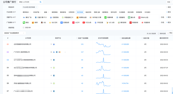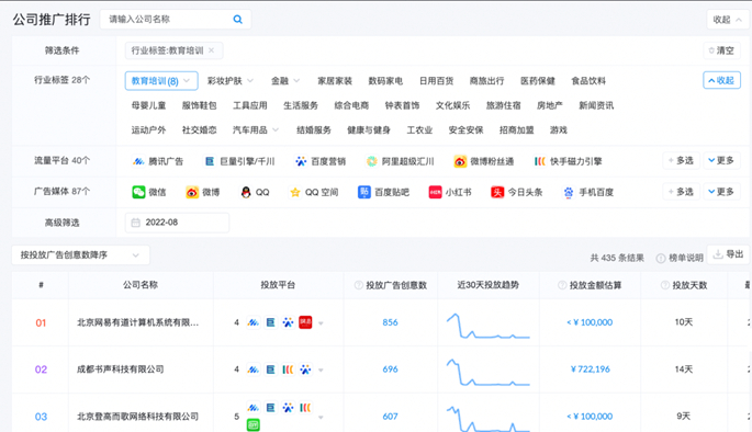 一键筛选出以表单留资为推广目的公司推广排行榜,该排行榜覆盖了教育培训、金融、家居家装、医药保健等28+行业,40+流量平台,80+媒体。支持按行业筛选出各大行业热投留资类公司,不管你是想找哪个品类的甲方,都能一键获取到一份高价值名单。