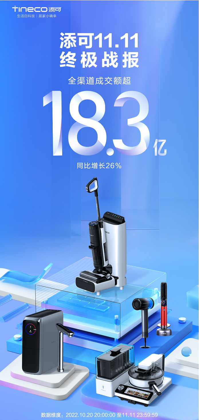2022年,面对外部环境的不确定性,添可以创新驱动品牌成长,陆续上新芙万空间站、芙万steam2.0、食万3.0 Pro等极具品类突破性的产品彰显品牌实力。双十一期间全渠道成交额超18.3亿,同比增长26%。截至今年上半年,洗地机品类在清洁电器市场的市场份额占比升至28.6%,添可也将在今年推动行业迈入百亿市场规模。