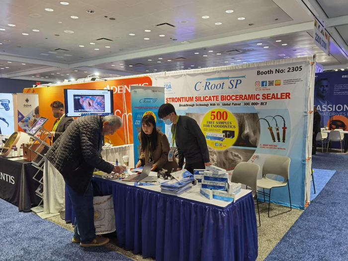 展会上,来自美国以及世界各地的众多根管医生驻足赛濡特展位,被C-Root SP进入牙本质小管,并在牙小管内形成锶代羟基磷灰石的根管再矿化电镜照片所震惊,在展位上观看了中国同行用硅酸锶糊剂C-Root SP充填的实操案例系列X线以及CBCT照片,现场试用C-Root SP根管充填糊剂,仔细观察外观颜色、颗粒细腻度,体验糊剂的流动性、粘稠度、饱和度等,连连感叹:中国的口腔生物陶瓷材料已经领先全球,当场登记申请马上试用。