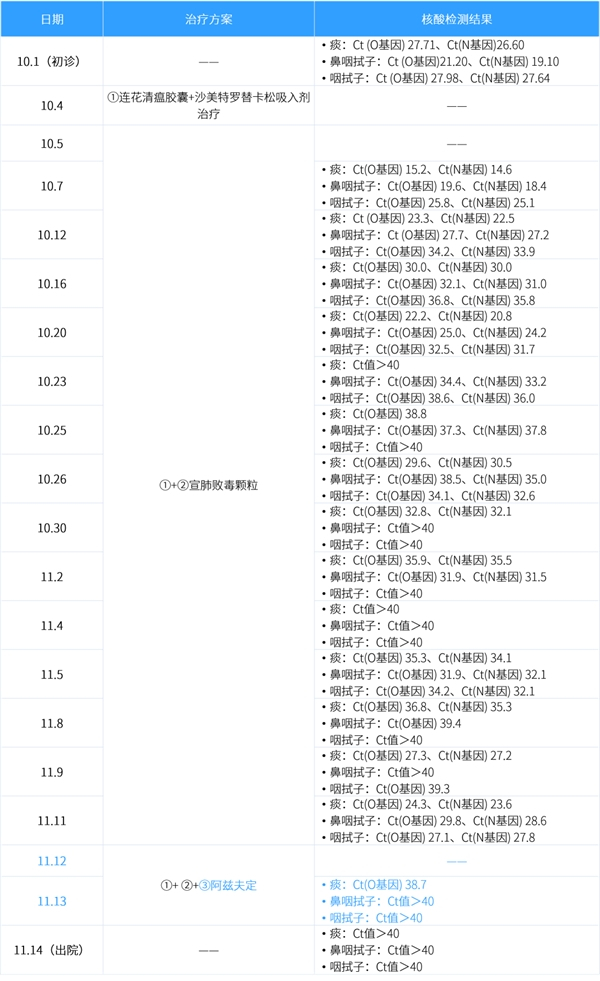 ➢10月4日给予口服连花清瘟胶囊清热解毒及沙美特罗替卡松吸入剂吸入控制哮喘;10月5日开始加用宣肺败毒颗粒。但患者的痰、鼻咽拭子、咽拭子的核酸Ct值持续波动,一直无法达到连续两次>35,因此长期无法达到出院标准。