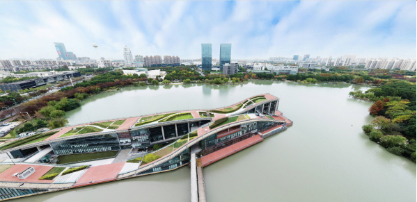 沿着淀浦河往东行,漫步至夏阳湖边,遥遥望去,水面上“漂浮”着一座造型奇特的建筑,这就是上海市青浦图书馆。
