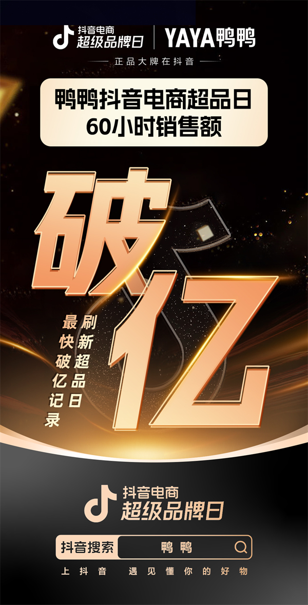 2020年经历了品牌重组的鸭鸭将战略重点转移到线上。在抖音电商打通电商链路之际,鸭鸭即刻入局,迅速建立起一套适用于兴趣电商的增长方法论,重新打开销售体量和品牌声量。2022年斩获抖音双11好物节服饰榜单TOP1,618女装TPO1;2021年摘得818新潮好物节、双11好物节、年货节等服饰榜单桂冠,并斩获抖音年度服饰总榜TOP1。此次YAYA鸭鸭刷新抖音电商超级品牌日最快破亿记录。