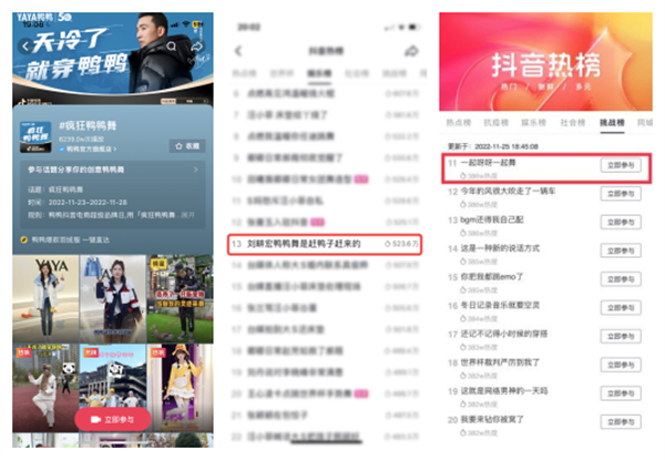 随后抖音站内掀起了疯狂鸭鸭舞的热潮。抖音头部健身达人刘畊宏在Y嘴鸭舞蹈的基础上进行改编,发起#疯狂鸭鸭舞#挑战赛。#刘畊宏鸭鸭舞是赶鸭子赶来的##一起呀呀一起舞# 话题一经发布,热度不断上升,登上抖音热榜。