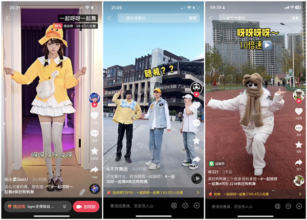 舞蹈类达人不齐舞团、小柔SeeU、321,健身类达人我叫七十五、Hang,搞笑达人无敌灏克等达人纷纷参与挑战,跨圈联动。#疯狂鸭鸭舞#话题上线不到一周,播放量超6000万次。