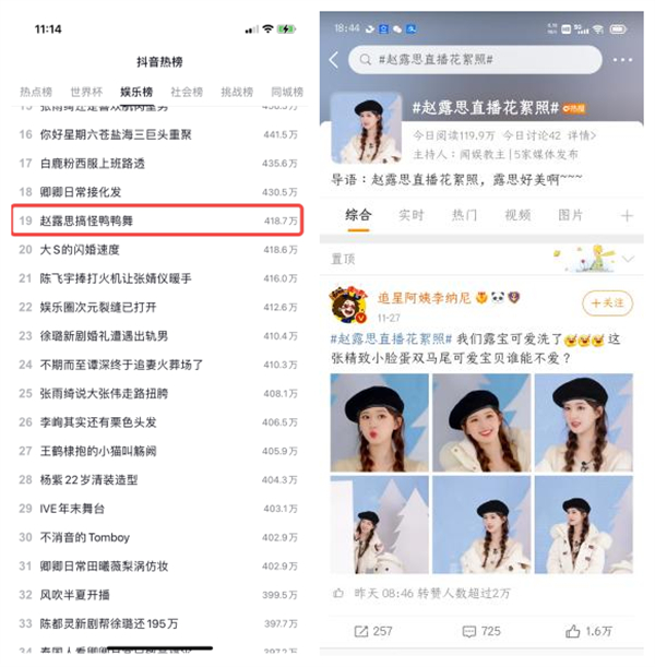 “天冷了就穿鸭鸭,鸭鸭鸭鸭鸭鸭鸭鸭”伴随着背景音乐的响起,赵露思在直播间跳起鸭鸭舞。在抖音站内,#赵露思搞怪鸭鸭舞#火速蹿上热榜。在站外,粉丝自发截屏分享直播视频、照片,#赵露思直播花絮#相关话题登上热搜,话题热度居高不下 。