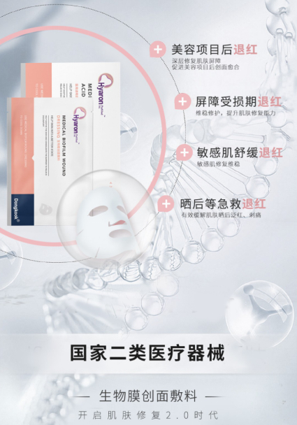 东国生物膜创面敷料,国家二类医疗器械资质,“械注准”退红面膜,主打退红,应用于美容项目后退红、敏感肌退红、日常皮肤急性期的退红等多场景,机构好评率高、销量前二的“械注准”退红面膜,用户反馈修复退红效果好。