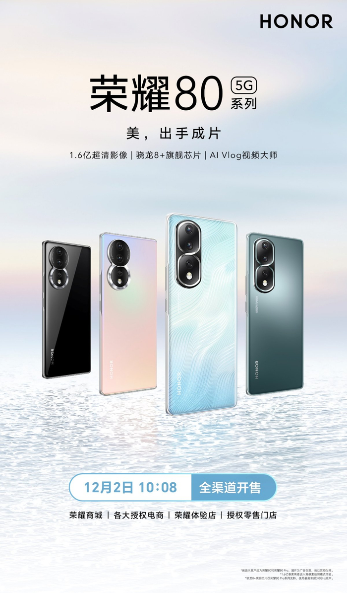 12月2日,荣耀80系列开启全平台销售,荣耀80、荣耀80 Pro售价分别为2699元起和3499元起。这次荣耀80系列全系配备1.6亿像素超清主摄,能够拍出更加清晰明亮的照片与视频;全新的AI Vlog视频大师功能,可以根据拍摄场景智慧推荐拍摄模式,一键生成Vlog短视频,帮助玩家快速进阶;骁龙8+旗舰芯片和唯美外观设计带来内外双修出色表现,全面覆盖年轻人需求,堪称2022年底压轴之作。