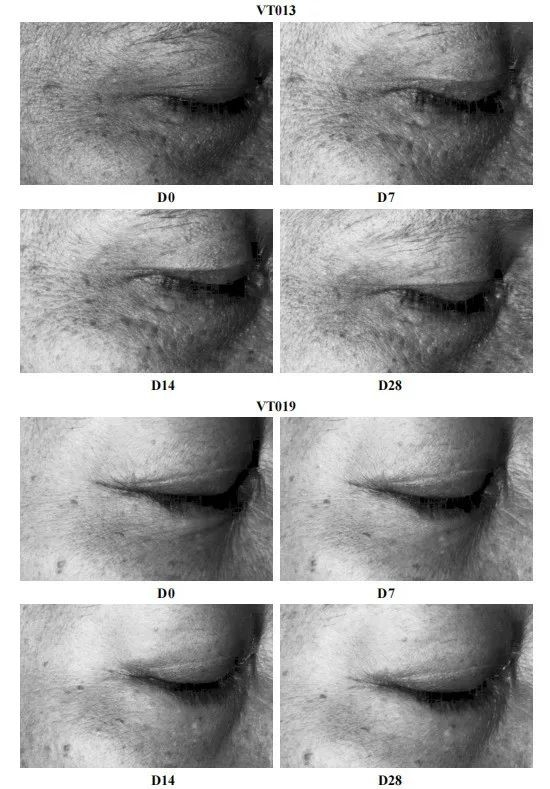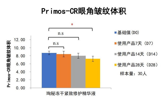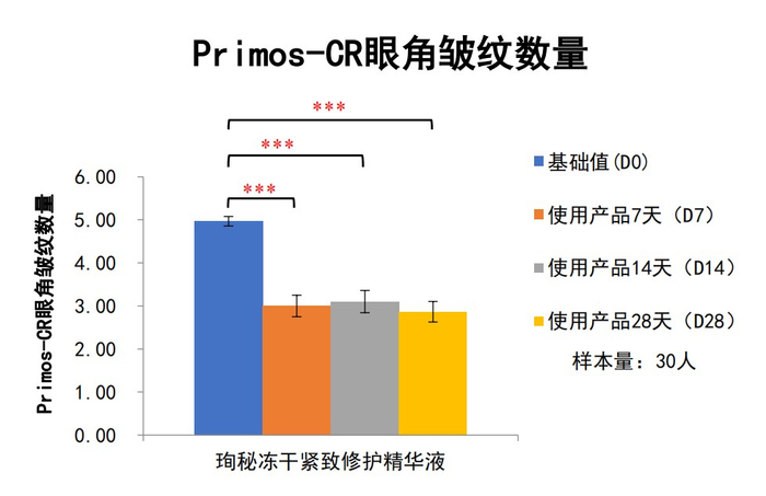 7 天受试者的 Primos-CR 眼角皱纹数量与基础值相比有显著性下降:39.60%;14 天下降率为 37.58%;28 天下降率为 42.28%。