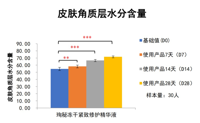 补水效果:7 天受试者的皮肤角质层水分含量上升 6.23%;14 天上升率为 21.44%;28 天上升率为 30.85%。