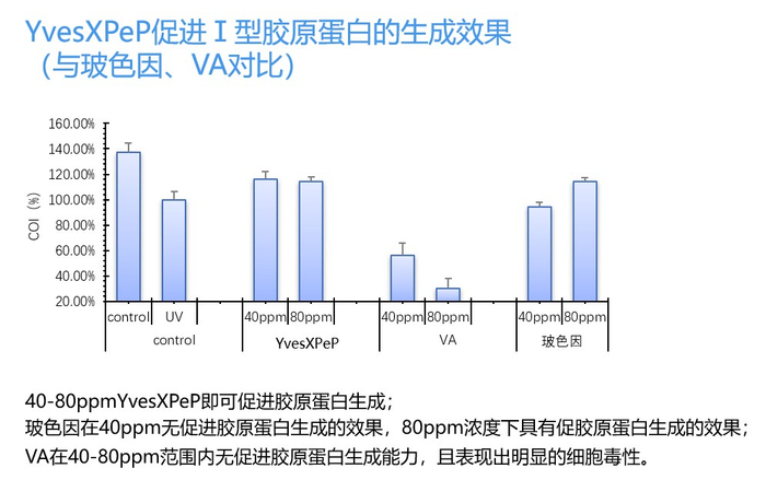 在这款创新的原料加持之下,YvesXPePTM海藻肽经过测试发现其对I型胶原蛋白的生成效果非常强,甚至优于VA以及玻色因。