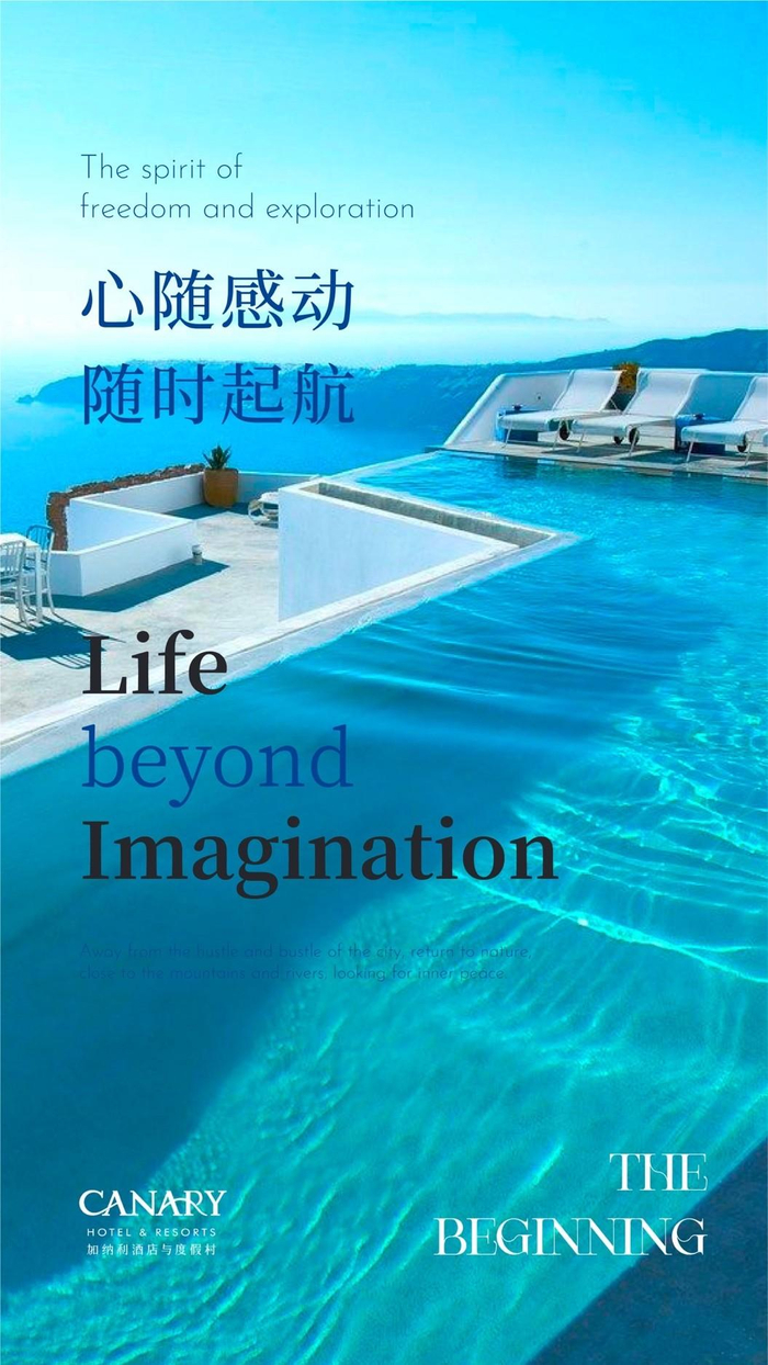 CANARY加纳利(Canary Hotel & Resorts 加纳利酒店与度假村)品牌灵感源于大西洋西属加纳利群岛,以“城市度假”为起点,将开放自由、如游动于海洋的度假空间生活方式带到中国,让度假无边界。在CANARY加纳利的空间表达中,糅合了达利的幻象、毕加索的抽象、与高迪的想象,大面积的留白与弧线设计弱化边界感,创造一个“可以自由躺的酒店”。即使深居闹市,只要踏入CANARY加纳利,即可纵身跃入地中海海岛的度假模式,感受阳光沙滩与海洋的专属夏日风情,拥有无限度假的惬意。