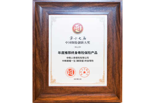 中韩人寿尊耀一生(臻享版)终身寿险荣获年度推荐终身寿险保险产品