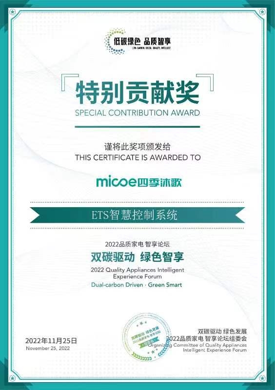 从“创新、协调、绿色、开放、共享”发展理念到双碳战略的提出,绿色理念在我国早已深入人心。纵观近些年我国家电产业在技术创新上的种种举措,从应用清洁能源,到改进生产技术,再到融合智能技术,可谓是将双碳践行落实到了方方面面。在本次论坛上获得“特别贡献奖”的四季沐歌ETS智慧控制系统,可谓集中反映了这一趋势。