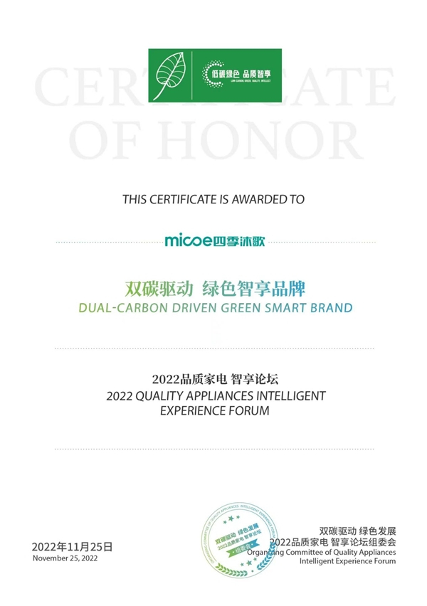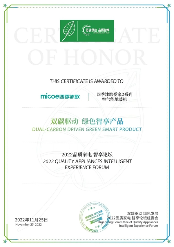 在政策和市场双重驱动下,如今“低碳绿色”发展理念已经成为家电行业共识。具体到产品上,家电企业更是不断在技术功能上寻求创新升级,以确保消费者在使用产品过程中收获更完善体验的同时,也让产品更具环保属性。在本次论坛上,四季沐歌爱家2系列空气能地暖机荣膺“双碳驱动 绿色智享产品奖”,正是从一个侧面印证了业界及消费者对于绿色家电升级成果的认可与推崇。