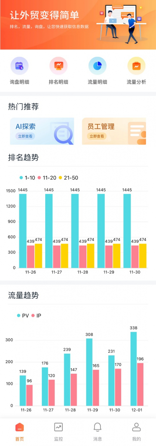 新版外贸快车APP摈弃了以往底部导航菜单稍显拥挤的界面显示,简化成”首页“、”监控“、”消息“、”我的“四个导航菜单,整体界面看上去更精致简洁,公司营销数据统计部分做了进一步优化,展示更加清晰明了。软件操作更加简便,用户更易上手,使用体验完美升级。
