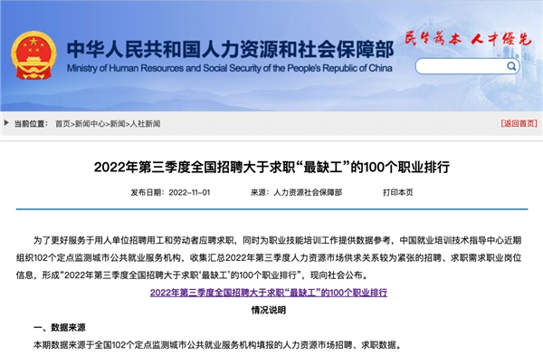 11月,人力资源和社会保障部发布《2022年第三季度全国招聘大于求职“最缺工”的100个职位》。其中,餐厅服务员、快递员、保洁员、保安等服务业职位常年排在用工缺口之列,物流及运输行业缺工程度有所增加,邮政营业员、道路客运服务员新进排行,快件处理员、道路货运汽车驾驶员、装卸搬运工等职业缺工程度加大。