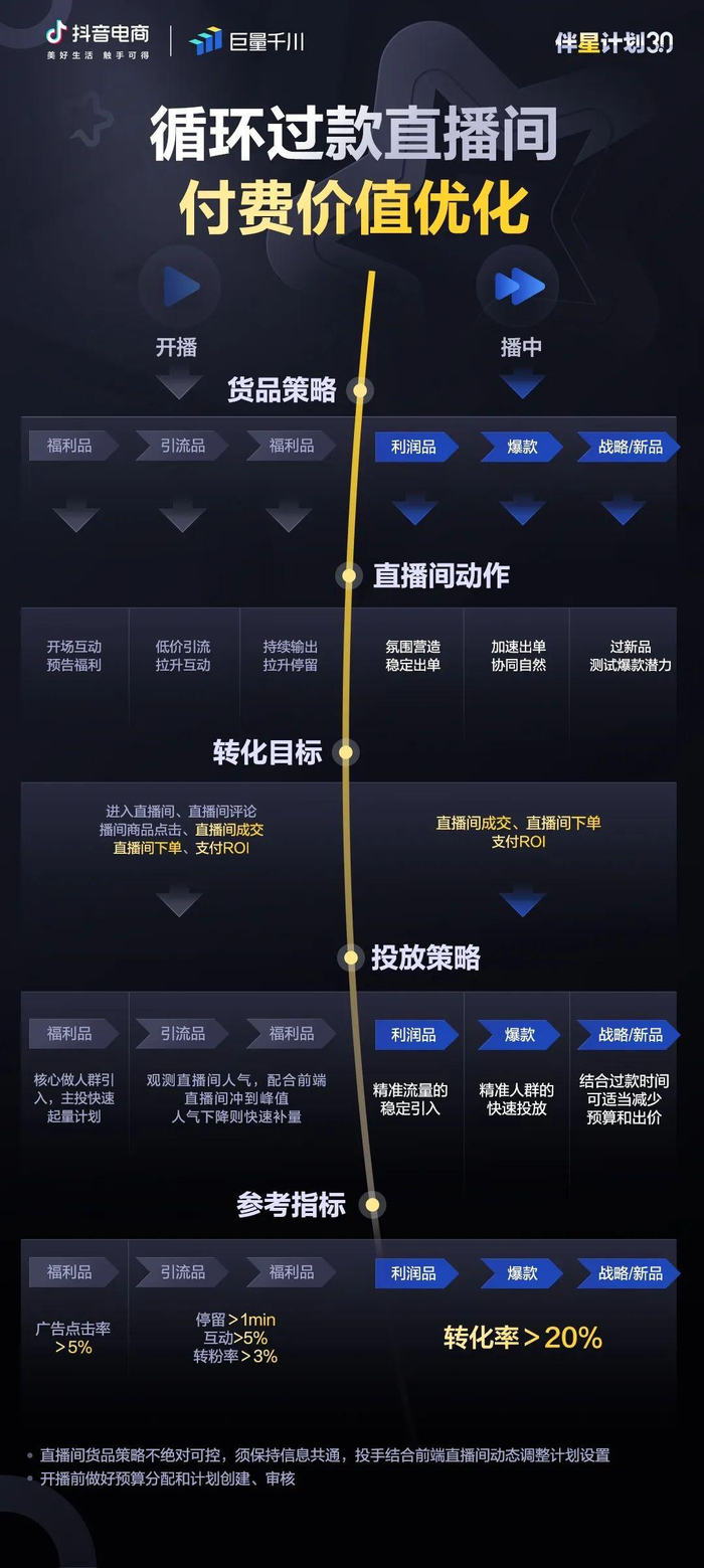如何通过「付费价值优化」,更好引入付费流量,实现生意增长模式的转变?本期「伴星计划3.0」专题内容从付费价值优化场景,为不同直播间提供了策略指导与产品应用指南。后续「伴星计划3.0」还将从投多赚多、冷启动、大促等场景入手输出方法论,并结合直播间利润分型,通过有针对性的扶持政策,实现品牌服务商“越投越赚钱”的新突破。