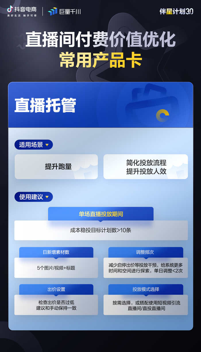 ∙「支付ROI」与「直播托管」保证直播间流量稳定引入,实现ROI提升;