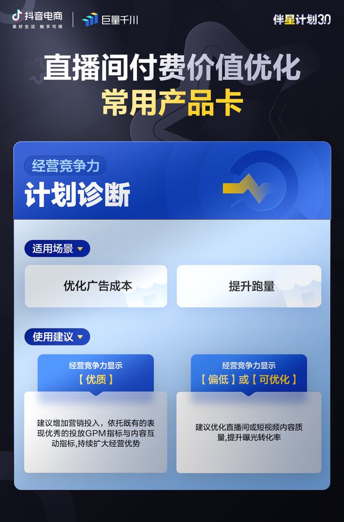 付费价值优化不仅需要顶层策略,同时还需要相关产品来对策略进行支持,恰到好处的产品应用可以帮助直播间突破流量及GMV瓶颈,提升付费价值优化场景的转化效率。在“付费价值优化”阶段「经营竞争力-计划诊断」「支付ROI」与「直播托管」三大产品的助力明显。