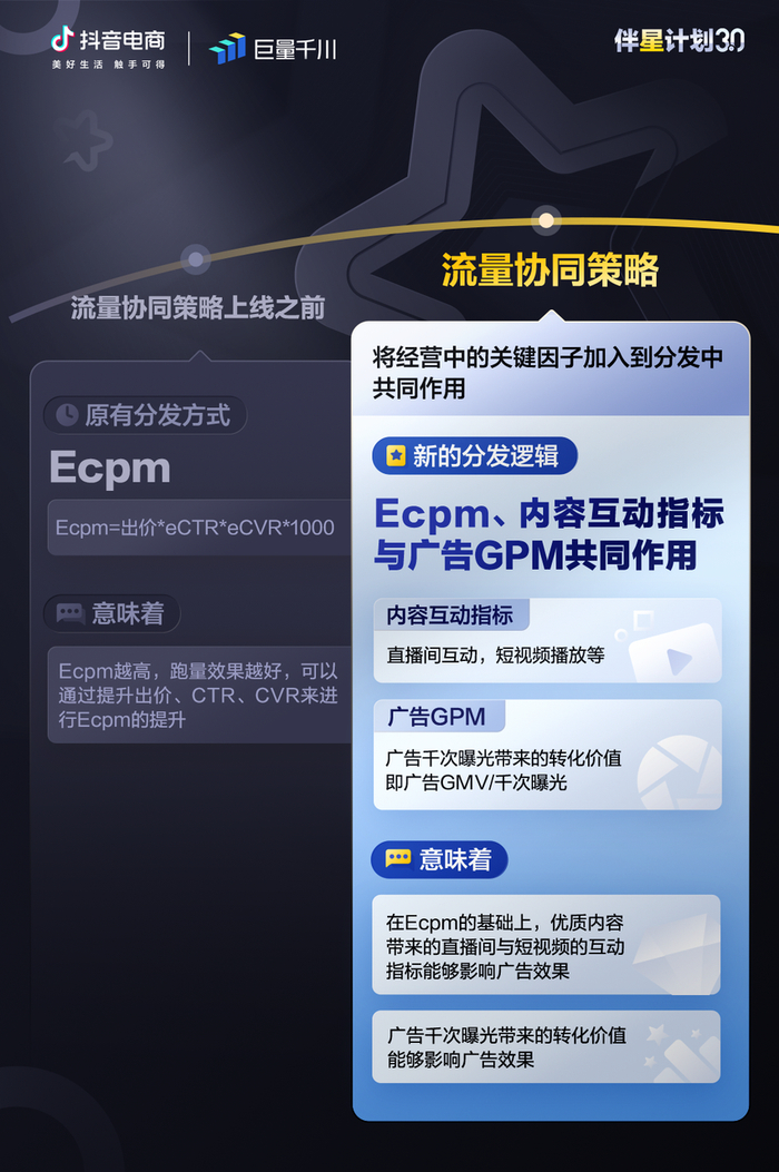 在巨量千川上线的全新流量协同策略下,优质内容带来的互动(如直播间互动、短视频播放等),以及作为衡量商家交易能力的重要指标——投放千次曝光带来的转化价值(GPM)等,都将对营销效果及直播间付费流量产生重要影响。