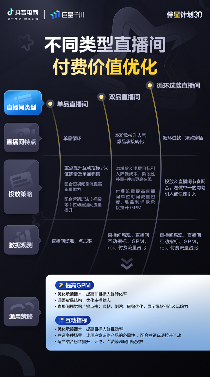 其中,直播场景下广告GPM的提升,需重点调整直播间话术、提高非目标人群转化率、优化货品结构等;而互动指标的提升则需配合营销玩法,提高目标人群互动率等。在具体操作中,单品、双品、循环过款直播间投放策略各有不同。