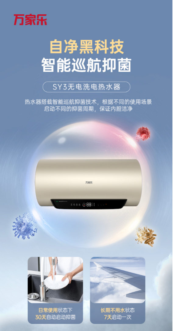 近年来,健康消费理念逐渐成为消费主力,沐浴水健康的概念更加深入人心。据奥维云网(AVC)线上监测数据显示,今年双11期间,电热水器在六大热水器细分品类中依旧保持亮眼增长,而具备健康、智能、节能等功能的电热产品越来越受到消费者青睐。日前,万家乐全新发布的SY3无电洗电热水器已上市,该产品兼具智能抑菌、水质检测、无电洗等多重功能,深受广大用户的好评。
