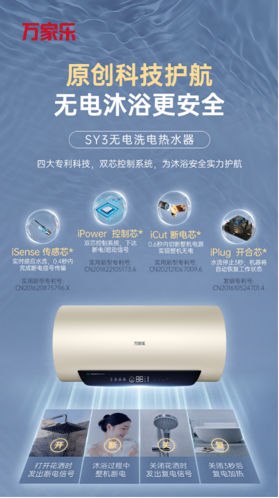 冬季人们对热水器的依赖更高,有些人为了安全起见,洗澡时会把电热水器的电源拔掉。万家乐从用户角度出发,针对沐浴时安全感低这一用户痛点,率先在业内推出无电洗技术,并实现了出水即断电的安全洗浴功能。