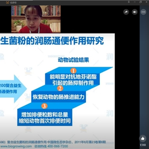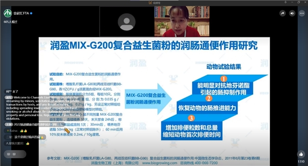 2022年11月29日-11月30日,江南大学&均瑶健康联合创新实验室主任、均瑶健康润盈首席科学家兼研发中心医药研究所所长田露露博士受邀出席,由食品商务网、食研汇、鼎忻展览、浙江食品添加剂协会共同举办的“2022肠道健康功能性原料应用创新论坛”,给参会人员带来《肠胃健康复合益生菌,赋能食品饮料创新》精彩直播分享,她主要围绕从肠胃健康市场趋势及消费洞察、益生菌对肠胃健康的影响及作用、润盈益生菌呵护肠胃健康基础研究、润盈复合益生菌产品设计及体感测试等四个方面重点阐述,获得了在线听众的一致好评。