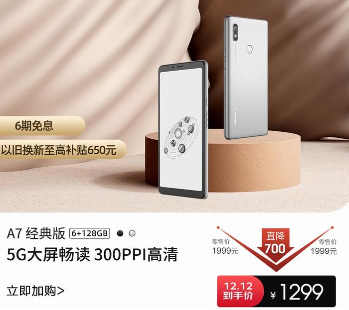 目前,海信阅读手机A7经典版6+128GB版本在京东自营旗舰店直降700元,到手价仅需1299元,还可享6期免息和以旧换新至高补贴650元。现在,不妨把你的阅读时间交给海信,为你的书海世界增添一抹别样的色彩。