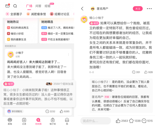 在大众的印象里,女性是一个“温柔且有力量”的群体。她们乐于与其他姐妹分享生活乐趣,讲述过往经验;也极容易对他人不好的遭遇产生共情,而后温柔抚慰。这些特质使得大量女性用户“群聚”在女性垂直社区。