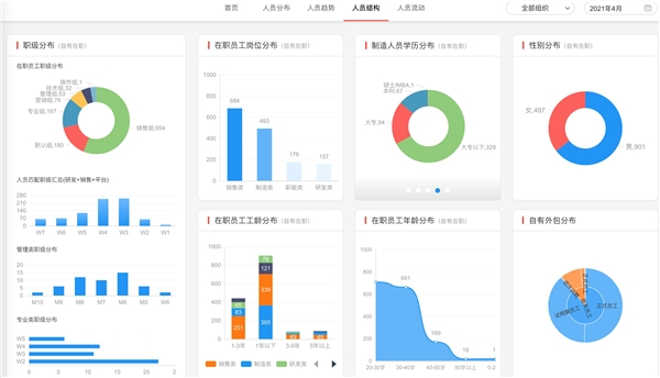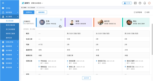 人事管理线上全流程处理,集团化统一动态管理。 薪事力人力云一方面能够将员工信息改为线上批量导入与维护,实现组织架构的线上统一规范化管理,并且能够根据组织架构管理进行灵活调整,历史架构可以进行追溯、查看,也是业内第一家支持人员数据实时历史快照恢复的产品;另一方面,员工的入转调离等信息都通过线上审批统一完成,将业务数据全面整合,能够实时全面的了解员工信息、对编制问题实现动态管理,让集团管理人员能够及时了解员工资源现状,制定与业务发展匹配的人力战略规划。