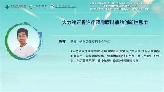 讲解的最后,施林老师也向参与论坛的各位国际专家发出邀请。欢迎各位专家来到云南昆明,来到圣爱中医馆,实地考察大力线正骨的技法,共同交流,为更广大的患者群体解除病痛。